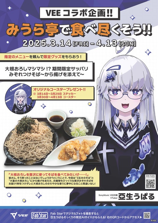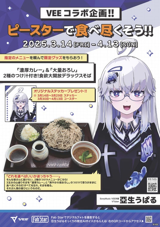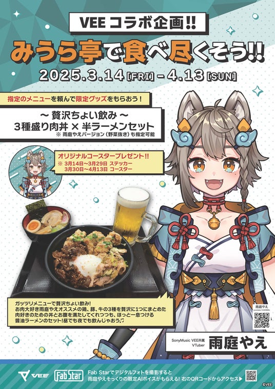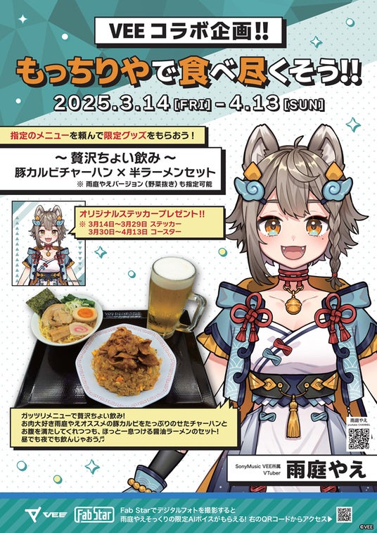 京急ロイヤルフーズ株式会社(本社:東京都・大田区、取締役社長:小島賢二)が運営する町中華「もっちりや」、レストラン「ピースター(ボートレース平和島劇場)」、黒湯天然温泉みうら湯内レストラン「みうら亭」において、ソニー・ミュージックエンタテインメントがVTuberのプロジェクトとして立ち上げたVEE所属「雨庭やえ」、「亞生うぱる」とコラボしたメニューを販売します。