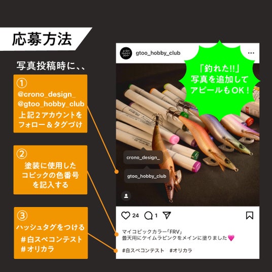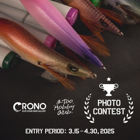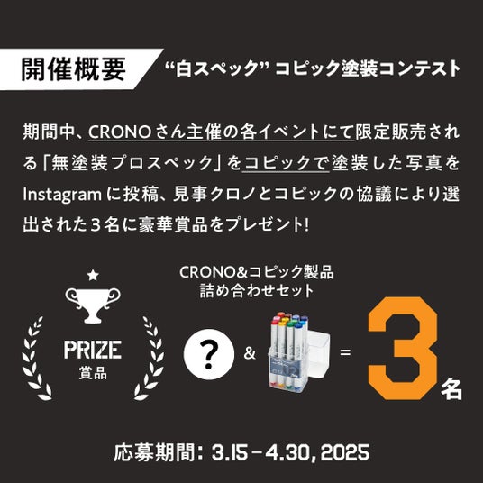 「西日本釣り博2025」ほか、CRONO主催の各イベントで限定販売を予定している「無塗装プロスペック」を購入しコピック製品で塗装したものを撮影してInstagramに投稿いただくと、3名様に豪華賞品が贈られます。2025年3月15日から4月30日までの投稿が選考対象となりますので、ぜひ奮ってご参加ください。