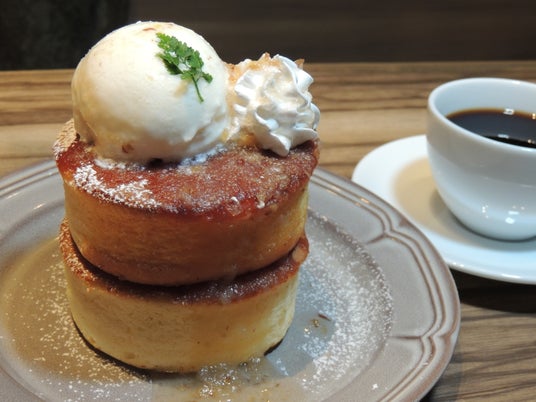 梨本来の甘さや食感を楽しめる多摩川梨ジャムを、濃厚なクリームチーズアイスを乗せたふわふわパンケーキの上にかけ、贅沢な組み合わせをお楽しみください。