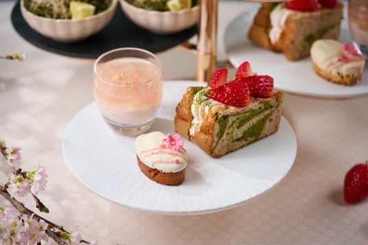 今回のアフタヌーンティーのテーマは「桜&抹茶」。桜の華やかな香りと抹茶の奥深い味わいに、甘くジューシーな旬のフルーツを贅沢に組み合わせた、春ならではのセレクションをご用意しました。