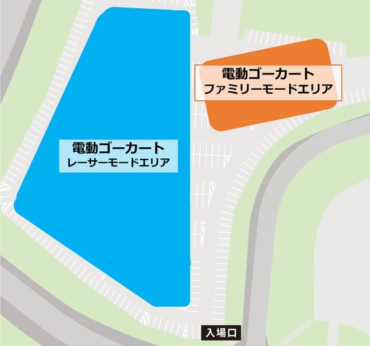 電動ゴーカートの最高速度は「レーサーモード(18km/h・自転車と同程度)」・「ファミリーモード(8km/h・早歩きと同程度)」の2段階設定と、搭乗者のレベルに合わせて選択可能です。爽快なスピード感を味わうことができ、簡単な操作で、幅広い世代に安心してお楽しみいただける本格的な電動ゴーカートです。