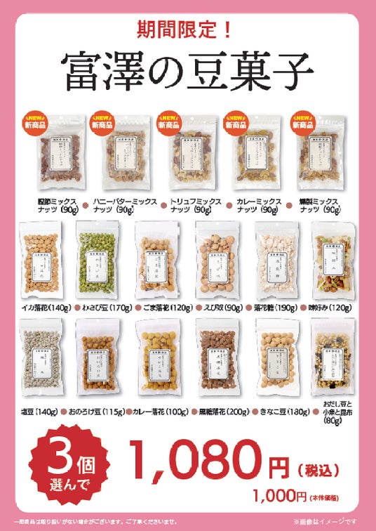 人気の豆菓子17種類から3個組み合わせ自由でお選びいただけるセット。