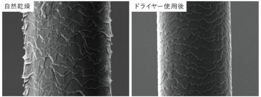 *自社測定。ダメージ処理を施した毛束に試験品処理を行い、電子顕微鏡にて観察。自然乾燥との比較。効果は使用環境(温度・湿度など)や個人差により異なります