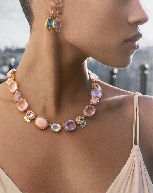 コレクションには、ネックレス、イヤリング、スタッドピアスが揃い、それぞれが個性豊かな宝石で彩られています。