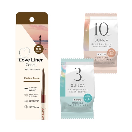 2025年3月に新登場したラブ・ライナーペンシルアイライナー極細楕円芯タイプ(ミディアムブラウン)と、SUNCA 薬用入浴剤 「繭のなか」「月のかさ」の2種類各1錠をプレゼントいたします。