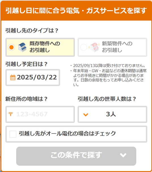 引越し先での電気・ガスの料金プランの同時比較・診断と申込が可能となりました。比較サイトにて、引越し予定日、引越し先の郵便番号、世帯人数を入力いただくと、診断結果が表示されます。