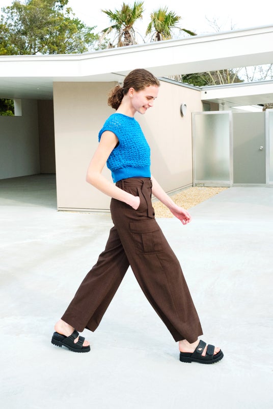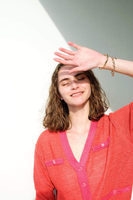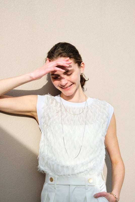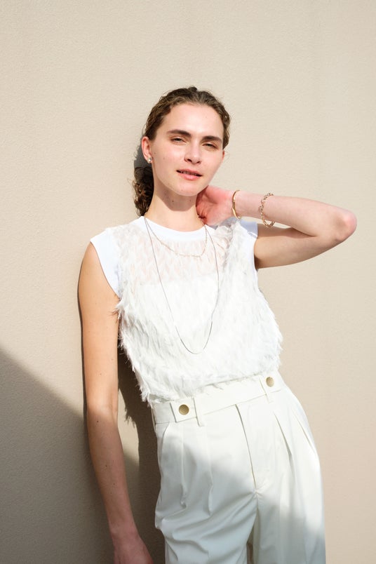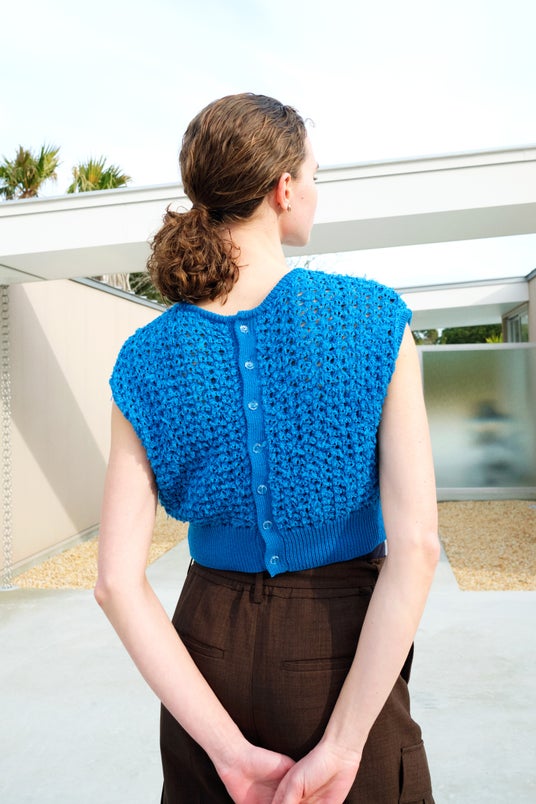 シアー素材のカーディガンは、ロング丈にもハイウエストにも合わせやすいコンパクトな作りに。