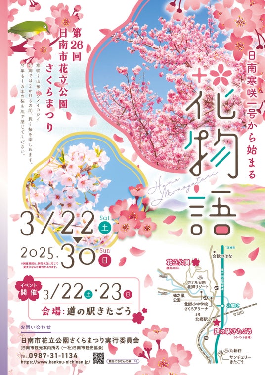 日南市は、宮崎県の南部に位置する市で、東に日向灘を臨み、西は都城市・三股町、南は串間市、北は宮崎市に隣接しています。平野部では、一年の日照時間が平均2,200時間以上と長く、年間を通して温暖な気候が特徴です。その気候を活かして、プロスポーツのキャンプなども盛んに行われています。その他にも、「九州の小京都」と称される飫肥(おび)城下町や、“水揚げ日本一“の「一本釣りカツオ」など、歴史や自然、グルメがあふれる観光の街です。 桜のシーズンを迎える3月には、3月22日(土)~3月30日(日)の期間、第26回日南市花立公園さくらまつりが開催されます。