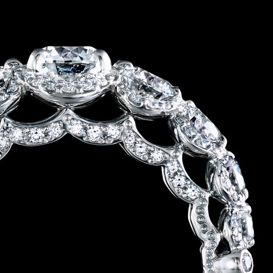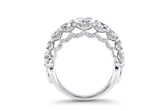 豪華に配された、9石全ての完璧な輝きのダイヤモンドを余すことなく堪能できるデザイン。指のラインに合うよう丸みを帯びた形状です。空間も美しくデザインしているサイドビュー。輝きだけで連なるようなラインはヨーロッパの美しいベールの装飾をイメージしています。