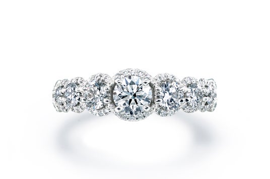 サイドのダイヤモンドの石座位置がセンターダイヤに近づくにつれて少しずつ高くなるため、より立体感を感じられ、美しく輝きます。