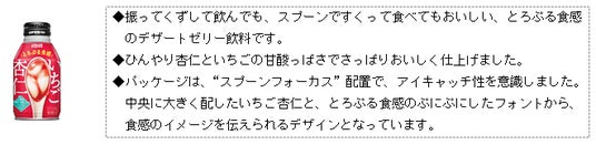 「いちご杏仁」は、ひんやり杏仁といちごの甘酸っぱさでさっぱりおいしい味わいに仕上げました。振ってくずして飲んでも、スプーンですくって食べてもおいしい、「とろぷる食感」のデザートゼリー飲料です。