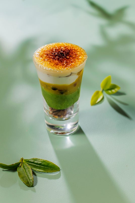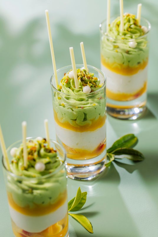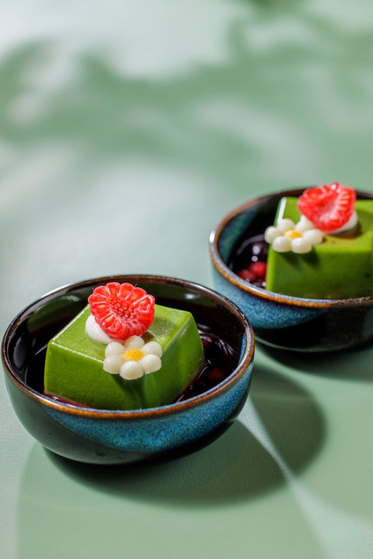 トロピカルな果実味とホワイトチョコレートの甘さ、そして抹茶の風味を絶妙なバランスで重ね合わせた「マンゴーと抹茶のホワイトチョコクリーム」や、アーモンド香るクリームに抹茶のほろ苦さを合わせた「抹茶のティラミスタルト」をはじめ、約20種類の香り高いデザートをご用意いたします。他にも「抹茶とパッションフルーツのキャラメリゼ」、「白玉と抹茶の水ようかん」、そして野点の風景を思わせるような「ほうじ茶と黄な粉のティラミス 日本庭園風“枯山水”」など、京都・宇治抹茶や愛知・西尾抹茶を中心とした上質な抹茶に多彩な素材を掛け合わせた、バラエティー豊かなラインナップを揃えました。いずれも、ペストリーシェフが一つひとつ巧緻を凝らし、丁寧に組み合わせた初夏にふさわしいデザートばかりです。