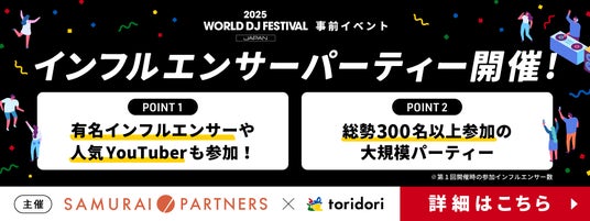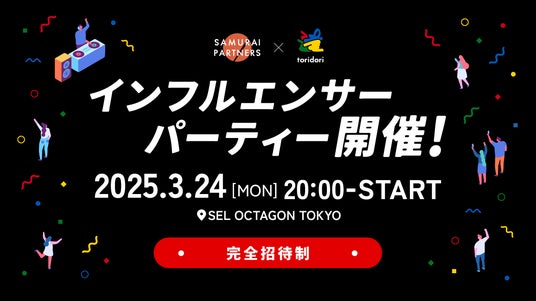 インフルエンサーマーケティングプラットフォーム『toridori marketing/toridori base(トリドリマーケティング/トリドリベース)』を中心としたインフルエンサーマーケティング事業を手がける株式会社トリドリ(本社:東京都渋谷区、代表取締役社長CEO:中山貴之、証券コード9337、以下toridori)は、株式会社サムライパートナーズ(本社:東京都千代田区、代表取締役CEO:入江巨之、以下サムライパートナーズ)と合同で3月24日(月)20時よりインフルエンサーパーティーを開催いたします。