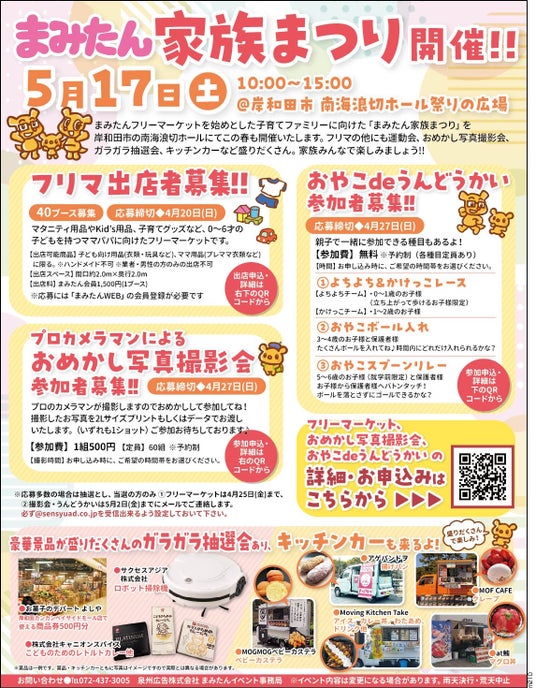 株式会社関西ぱど(本社:大阪市西区靭本町1-10-24 三共本町ビル5F 代表取締役 富岡 紀幸)は、関西ぱどと同グループで「まみたん泉州版・和歌山版」を発行している泉州広告株式会社と連携した取り組みとして、2025年5月17日(土)に「まみたん家族まつり」を岸和田市の南海浪切ホールにて開催します。