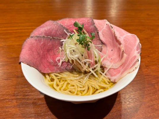 黒毛和牛のチャーシュー、ボヨヨンチャーシュー、ガンバルポンチャーシューの3種を贅沢に乗せ、さらにホワイトトリュフオイルで上品に仕上げ、人類みな麺類の醤油と合わせたナニワを感じるラグジュアリーな一杯。(数量限定)