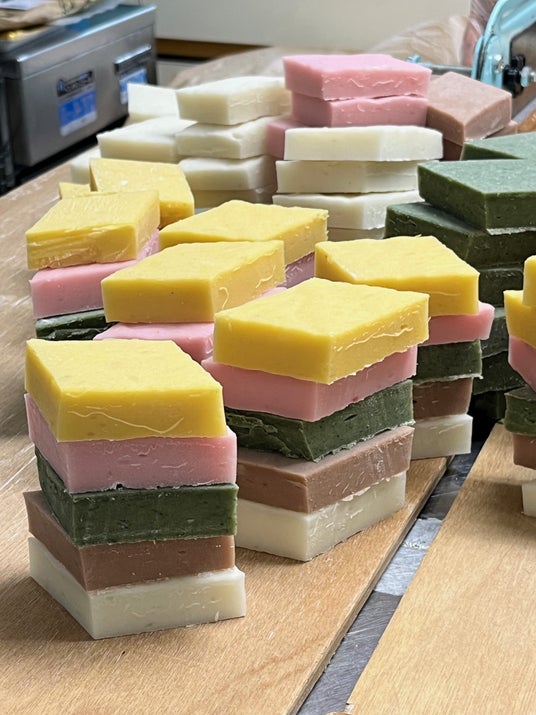 この『5色のひし餅』は、約40年ほど前に地域の特産品になればと地元住民有志で考案されましたが、メンバーの高齢化などから、ここ10年ほどは同民宿の女将である水野美代子さんが、餅をついて自然由来の原料で着色、カットして真空パックにする工程までをお一人で担い、地域の特産品を守り続けています。厚さ約2センチの餅は下から、雪を表す白い「白餅」、雪解け後の土を表す茶色の「きび餅」、若葉の芽吹きを表す緑色の「よもぎ餅」、赤カブの汁を使って咲き誇る花を表すピンクの「紅(べに)餅」、実りを表す黄色の「カボチャ餅」と自然の素材を使った5色で季節の移り変わりを美しく表現しています。きびを除く材料は、すべて水野さんの自家製で、色だけでなく香りも楽しめます。