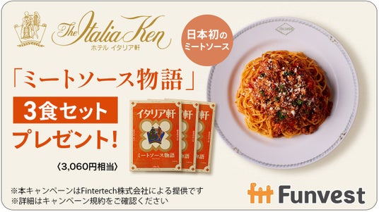 【A賞】300万円以上の出資でもれなく【B賞】抽選で10名様に「ホテルイタリア軒ミートソース物語」3食セット(3,060円相当)」をプレゼント!