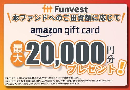 本ファンドへ出資していただいた投資家の皆様を対象として、出資額に応じて最大20,000円分のAmazonギフトカードをプレゼントするキャンペーンも併せて実施いたします。