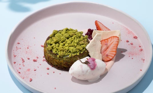 抹茶チーズケーキに抹茶ガナッシュとクランブルを重ね、桜クリームと桜アイスを添えた季節を感じる贅沢なスイーツ。