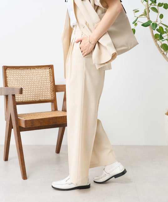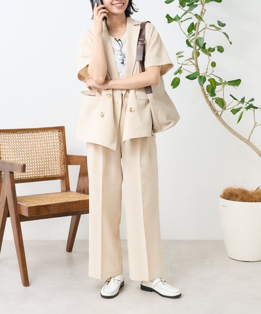 半袖ジャケットとパンツがセットアップでオフィスに使いやすく、リネンのような涼しげな生地感でかっちり見えしすぎないリラックス感。