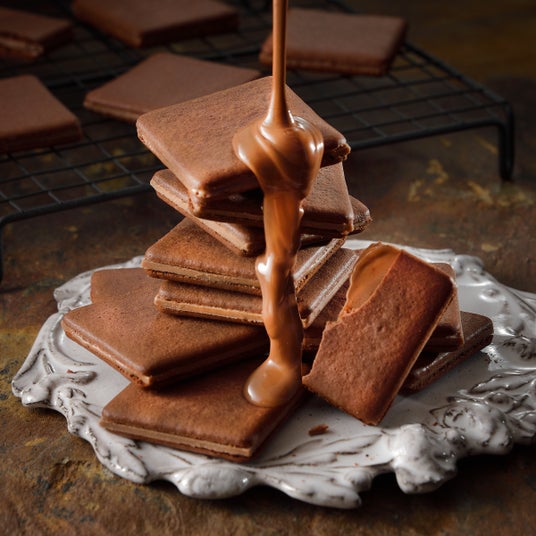 【2品目】神戸ミルクチョコラングドシャほろ苦いココアラングドシャでミルクチョコプレートを挟み、さっくりと軽やかな食感のラングドシャに仕上げました。