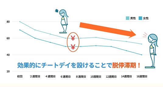 停滞期を打破! カロリー制限が続くと基礎代謝が低下する可能性があり、体重・体脂肪率が変わらない状態が続く場合、チートデイを活用して代謝を促進します。