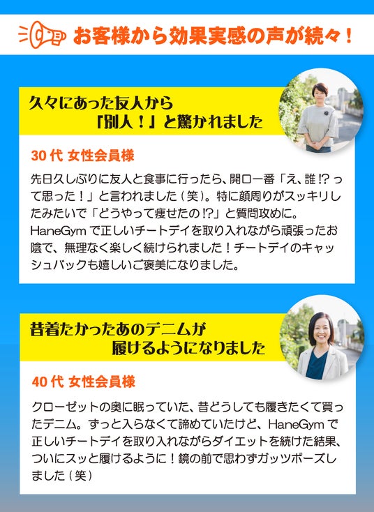 「食べる楽しみを持ちながら、しっかり痩せたい」「ダイエットを継続できる形にしたい」そんな方は、ぜひHaneGymのチートデイキャンペーンを体験してみてください!