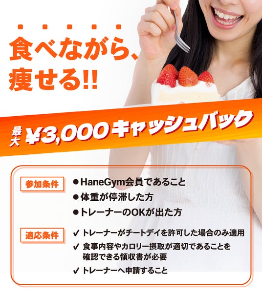 このキャンペーンでは、 HaneGymがあなたのチートデイ費(3,000円まで)を負担!