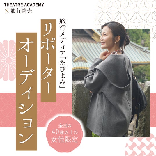 1980年の創業以来、さまざまな分野で活躍できるタレントを輩出し続けてきたテアトルアカデミーと、「知るほど旅は楽しくなる。」をコンセプトに、日本国内・海外のさまざまな観光スポット、グルメ、温泉、絶景など、旅の魅力を発信するメディアサイト「たびよみ」のコラボオーディションです。