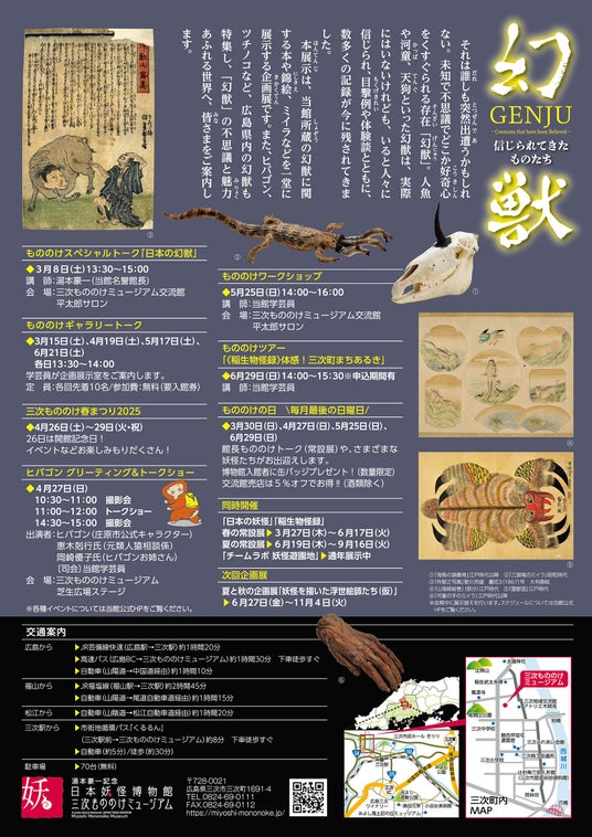 【その3.】 未確認生物「ヒバゴン」(庄原市西城町)や「ツチノコ」(府中市上下町)、初公開『天狗の爪』(三次市作木町・常清山東光坊蔵)など、広島県ゆかりの「幻獣」を特集し、紹介します!