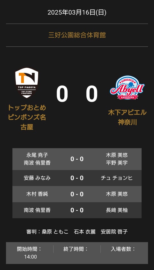 ノジマTリーグ 2024-2025 公式戦 3月16日開催 トップおとめピンポンズ名古屋 vs 木下アビエル神奈川 オーダー発表