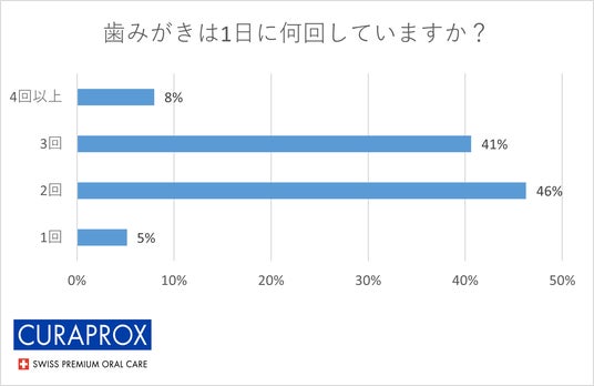 1日に2回歯をみがくは46パーセント、3回磨く女性は41パーセント。女性の95パーセント以上が1日に2回以上、歯を磨いています。