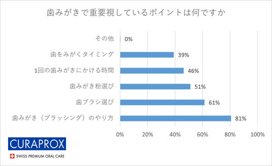 81パーセントの女性が歯みがき(ブラッシング)のやり方を重視しています。また半数以上が歯ブラシや歯みがき粉選びも重視しています。