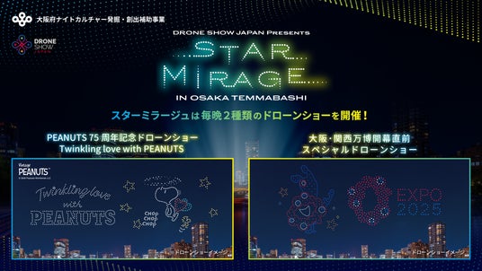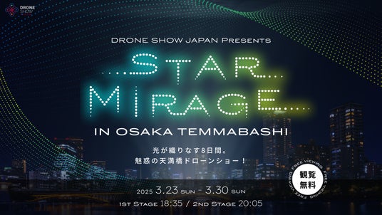 日本唯一のドローンショー専用機体『DSJ MODEL-X』を開発し、国内ドローンショー実績No.1※ の株式会社ドローンショー・ジャパン(本社:東京都港区、代表取締役社長:山本 雄貴、以下DSJ)は、2025年3月23日(日)から30日(日)までの8日間、川の駅はちけんや周辺(大阪市中央区北浜東)にて、観覧無料のドローンショーイベント『DRONE SHOW JAPAN PRESENTS STARMIRAGE IN OSAKA TEMMABASHI[ドローンショー・ジャパン・プレゼンツ・スターミラージュ・イン・オオサカ・テンマバシ]』(以下、本イベント)を開催いたします。