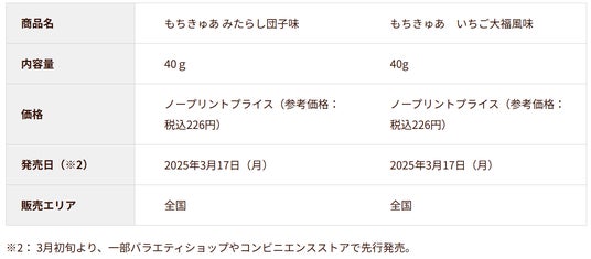 この度、現在販売中の「もちきゅあ」でお客様よりご評価いただいているもちもちとした「食感」の強みと昨今の「ネオ和菓子」ブーム、さらに世界での日本食の人気とインバウンド需要も見込み、「もちきゅあ」を“和グミ”としてリニューアルすることといたしました。“和グミ”「40g もちきゅあ みたらし団子味」と「40g もちきゅあ いちご大福風味」の2品を2025年3月17日(月)より全国発売いたします。それぞれ「お団子のようなグミ」、「大福のようなグミ」という、今までにない味わいをお楽しみいただける商品です。