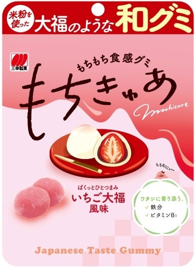 もちきゅあ いちご大福風味「もちきゅあ いちご大福風味」は「もちきゅあ」の“和グミ”としてのフレーバーを検討するなかで、和菓子、特にネオ和菓子としても人気の高いフルーツ大福の、その中でも代表的な「いちご大福」を採用しました。いちごの酸味とあんこのコクと甘みのマリアージュの再現に加え食感の改良も行い、これまでの「もちきゅあ」各品とは異なる、まるで大福のような「もちもち」食感をお楽しみいただける一品です。