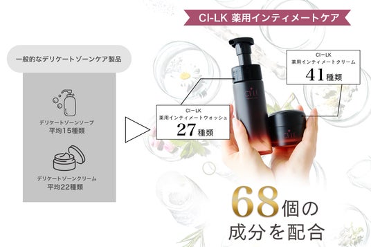 一般的なデリケートゾーン用ウォッシュに配合されている成分は、平均15種類程度。デリケートゾーン用クリームは、平均22種類の成分が配合されていますが、CI-LKの製品はそれぞれウォッシュに27種類、クリームに41種類と、約2倍の低刺激成分を配合しています。
