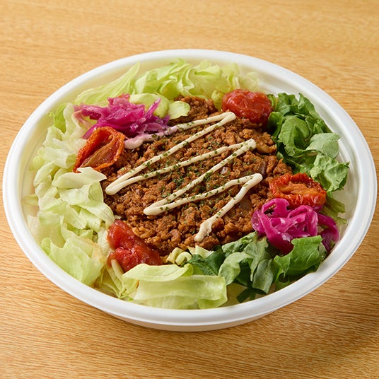 【内容】大豆ミートを使用したスパイス感のあるタコスミートに、レタスやグリーンリーフ、セミドライトマトなどの野菜を彩りよくトッピングしたタコライスです。