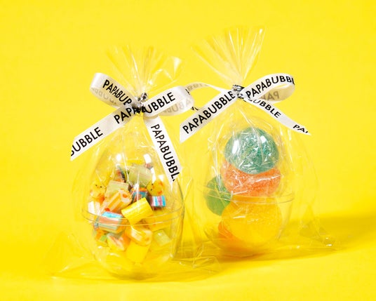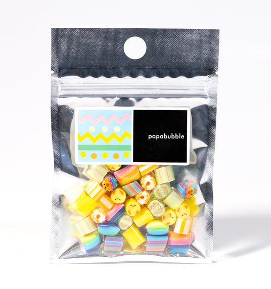 「HAPPY EASTER」の文字の中央には、トロッとしたタマゴの黄身をデザインしました。ツヤ感のある透明な キャンディで仕上げた、パパブブレ職人の遊び心が光るイースターらしさ満載の商品をお楽しみください。
