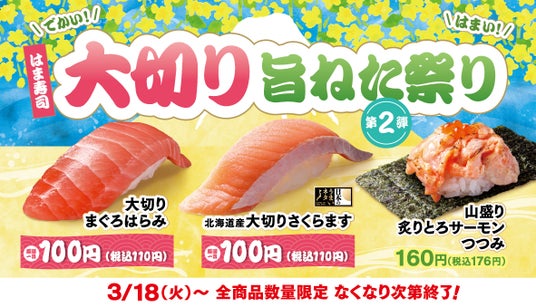 株式会社はま寿司(代表取締役社長:町野 岳 本社:東京都港区)が展開する100円寿司チェーン「はま寿司」は、3月18日(火)より「はま寿司 大切り旨ねた祭り 第2弾」を開催します。