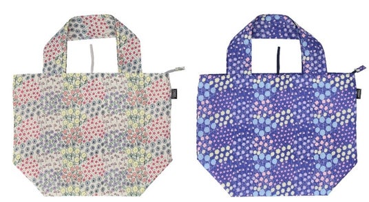 北欧の夏。草地にたくさんの野花が咲く様子を描いたデザイン。ファスナー付きで荷物をしっかり収納でき安心。また折り畳んでコンパクトにまとめることができるゴム付きで持ち運びやすく機能性抜群。手洗い可能です。