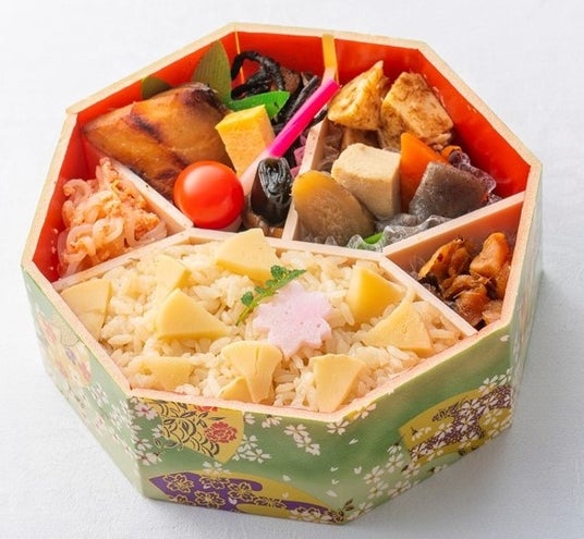 桜海老御飯に、国産牛ローストビーフや桜島鶏つくね焼などを合わせた春限定のお弁当です。