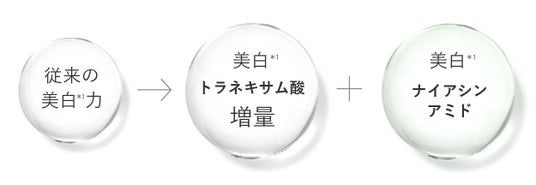 トラネキサム酸を美白(*1)有効成分として認証される濃度まで増量したことで、ナイアシンアミドとともにパワーアップしたWの薬用美白効果をご体感いただけます。