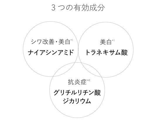 「ナイアシンアミド」「トラネキサム酸」「グリチルリチン酸ジカリウム」の3つの成分で薬用承認を取得し、シワ改善・美白・肌荒れ防止の3つの効果を発揮します。