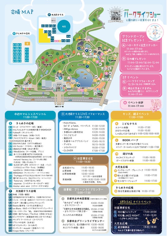 新しくなった多摩中央公園で行うはじめてのイベントは、地域の方々とともに企画盛りだくさんで行います。園内にはカフェとレストランが2店舗オープン、そしてエディブル&フラワーガーデン、遊具なども備わり、特別な日常のひとときを過ごしていただけます。