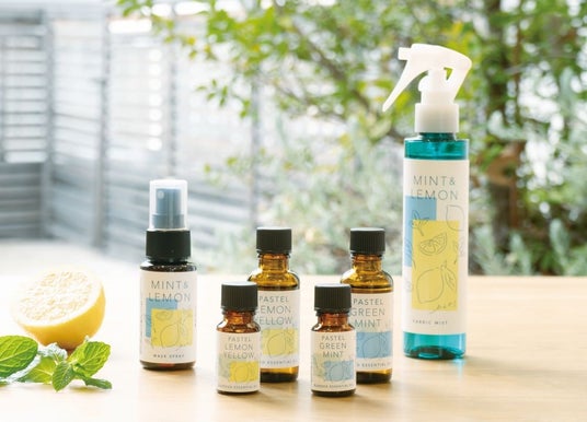 (左から)マスクスプレー 50ml、ブレンドエッセンシャルオイル パステルレモンイエロー 10ml /30ml 、ブレンドエッセンシャルオイル パステルグリーンミント10ml / 30ml 、