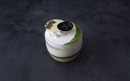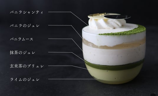 抹茶とバニラが織りなす、なめらかな口どけのヴェリーヌ。生地を使わず、幾層にも重ねたクリームとジュレが織りなす、なめらかで奥行きのある味わいが特徴です。ライムのジュレの爽やかな酸味をベースに、香ばしい玄米茶ブリュレ、風味豊かな抹茶ジュレ、軽やかなバニラムース、ライムピューレを加えたバニラジュレを重ね、仕上げにバニラシャンティを添えました。