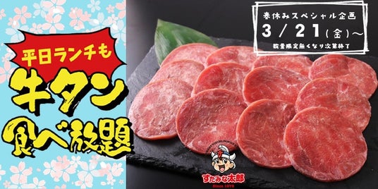 焼肉・寿司・スイーツ食べ放題レストランチェーンの「すたみな太郎」(運営元:株式会社江戸一、本社:東京都足立区、代表取締役社長:珊瑚 卓哉)は、3月21日(金)より春休みスペシャル企画として、平日ランチ時間帯に食べ放題料金はそのままにスペシャル人気メニュー「牛タン」を食べ放題メニューとしてご提供いたします。「お求めやすい価格帯の平日ランチに、春休み中のお子様とのお食事の時間をより楽しんでいただきたい。」という想いで期間限定で人気焼肉メニューの「牛タン」を平日ランチ時間帯にご提供いたします。