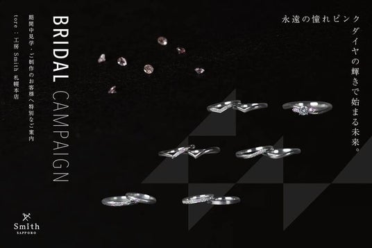北海道札幌の手作り結婚指輪・婚約指輪専門店「工房Smith札幌本店」がこの春ブライダルキャンペーンを実施いたします。「永遠の憧れ ピンクダイヤの輝きで始まる未来」をテーマに、結婚指輪・婚約指輪のご成約カップルに、豪華な特典をご用意いたしました。是非、かけがえのない思い出を大切な方とご体感ください。