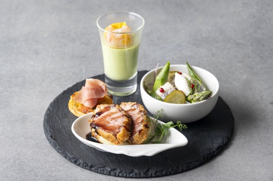 上段には春の訪れを告げるニシンと春先に旬を迎える瑞々しいアスパラガスを合わせた「ニシンのマリネ」を。ガーリックの風味がほどよく効き、マリネの爽やかさが口に広がります。彩りを添えるピンクペッパーのピリッとした辛さが味わいにアクセントを加えます。また、ぜひ味わっていただきたいのは肉厚で旨味豊かな鴨をカツに仕上げた一品。食べ応えがあり、お腹も満たされます。